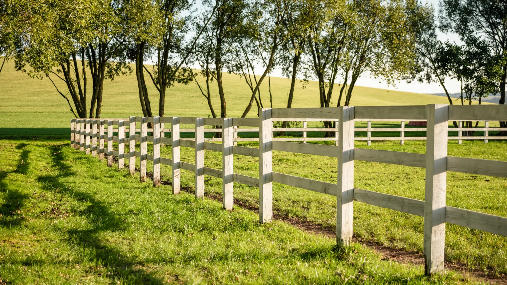 - Traditional wood post and rail farm fences that create clean boundaries for pastures and paddocks